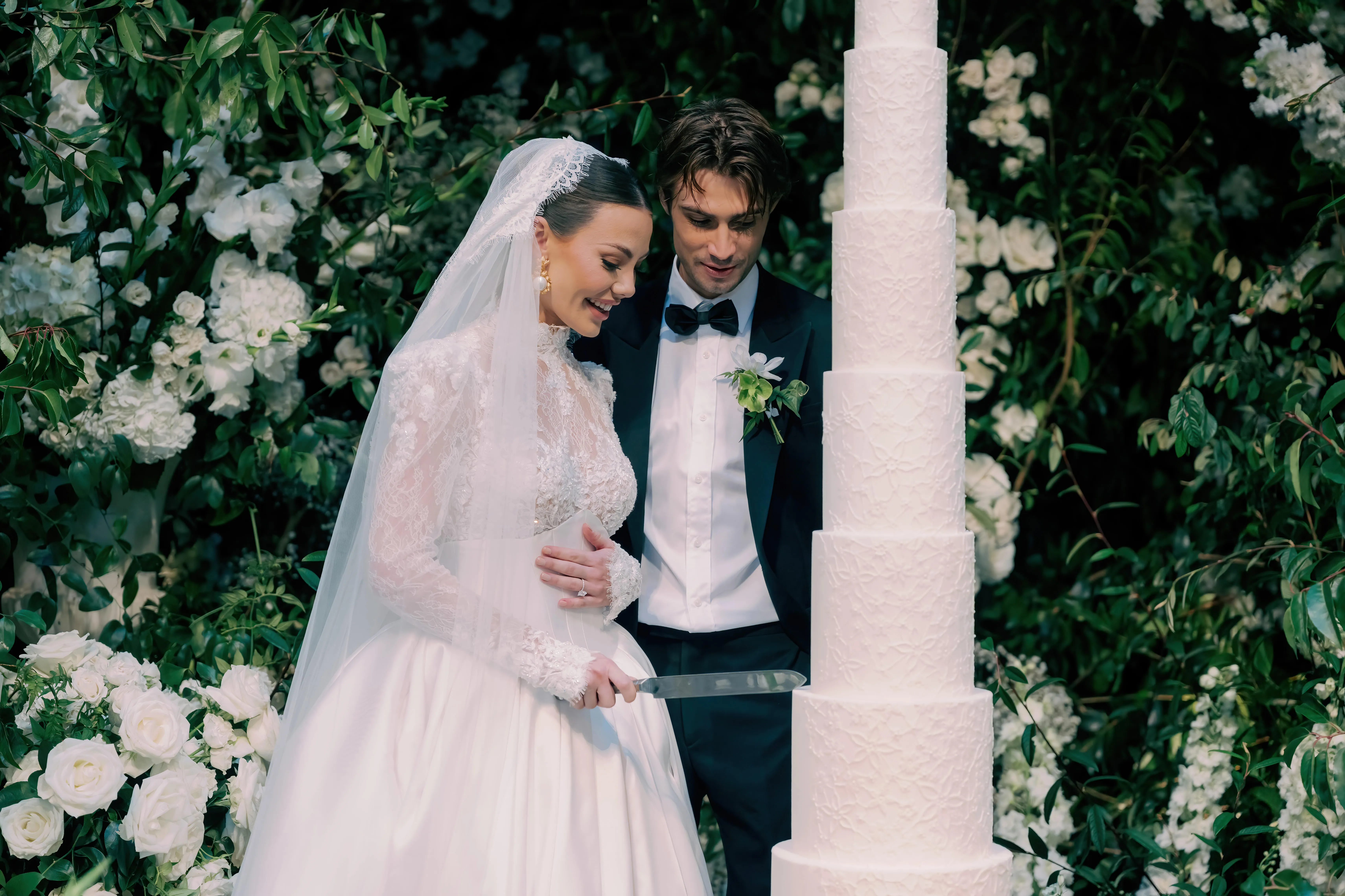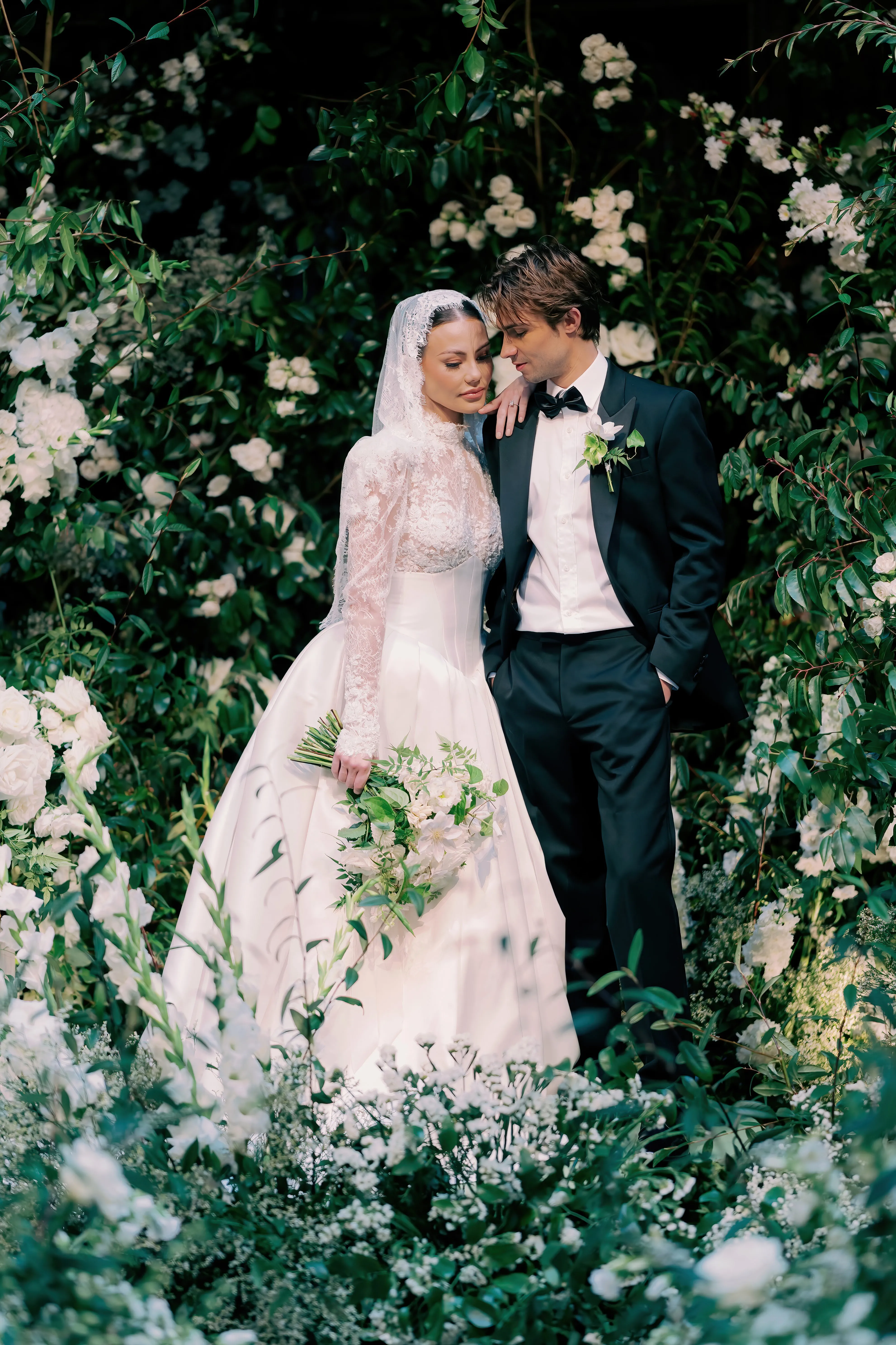 - An off-the-shoulder gown with a cathedral-length veil for the bride