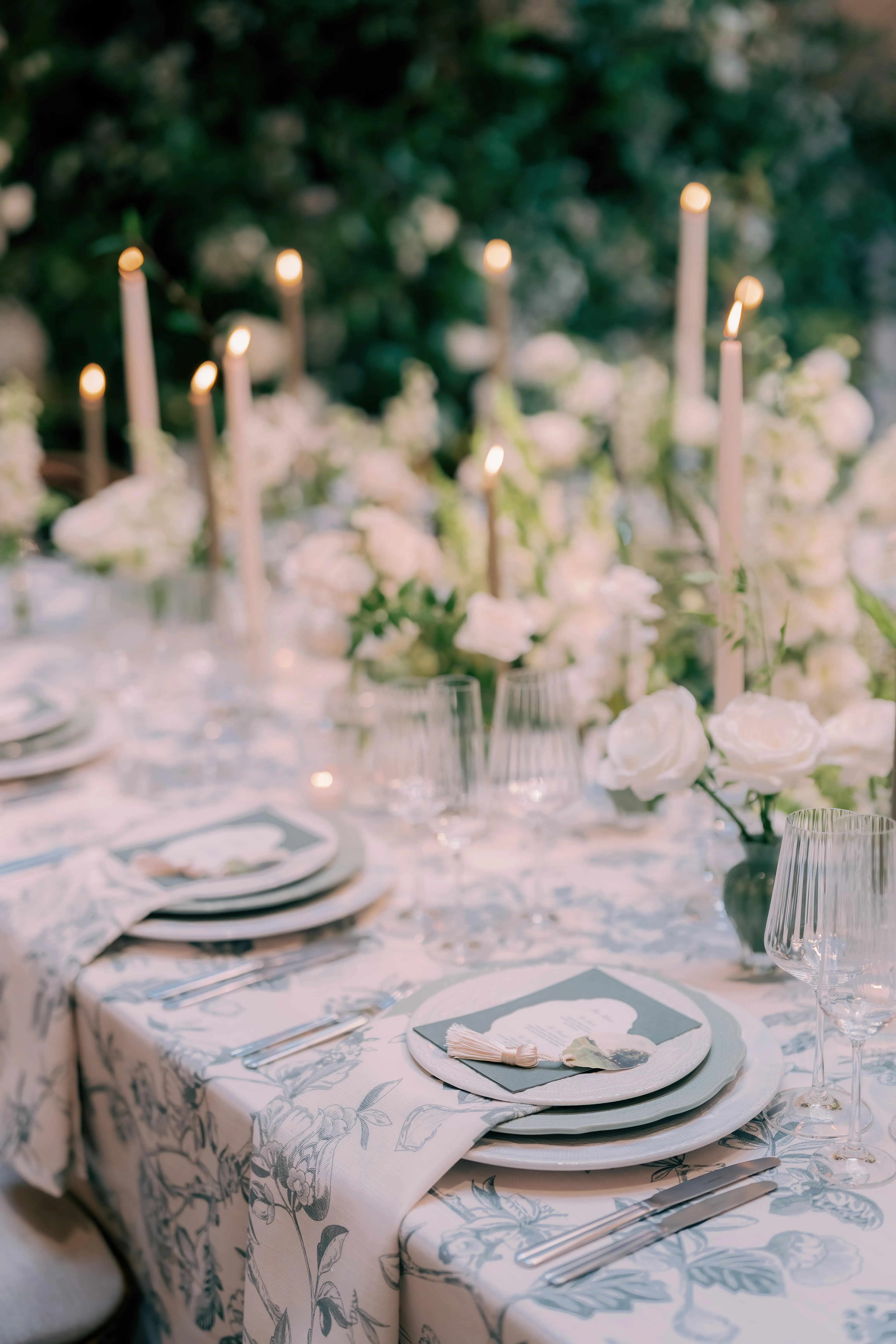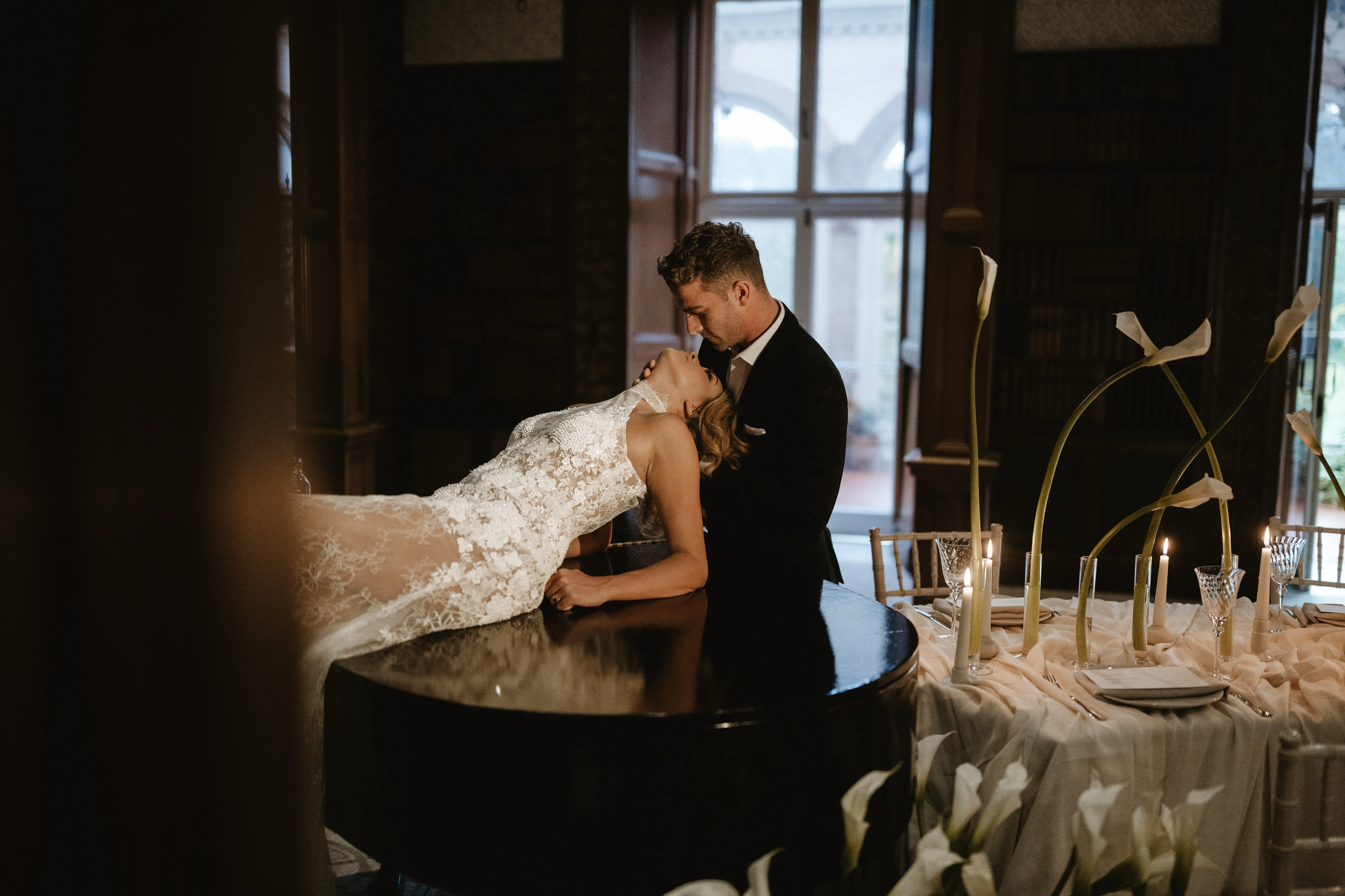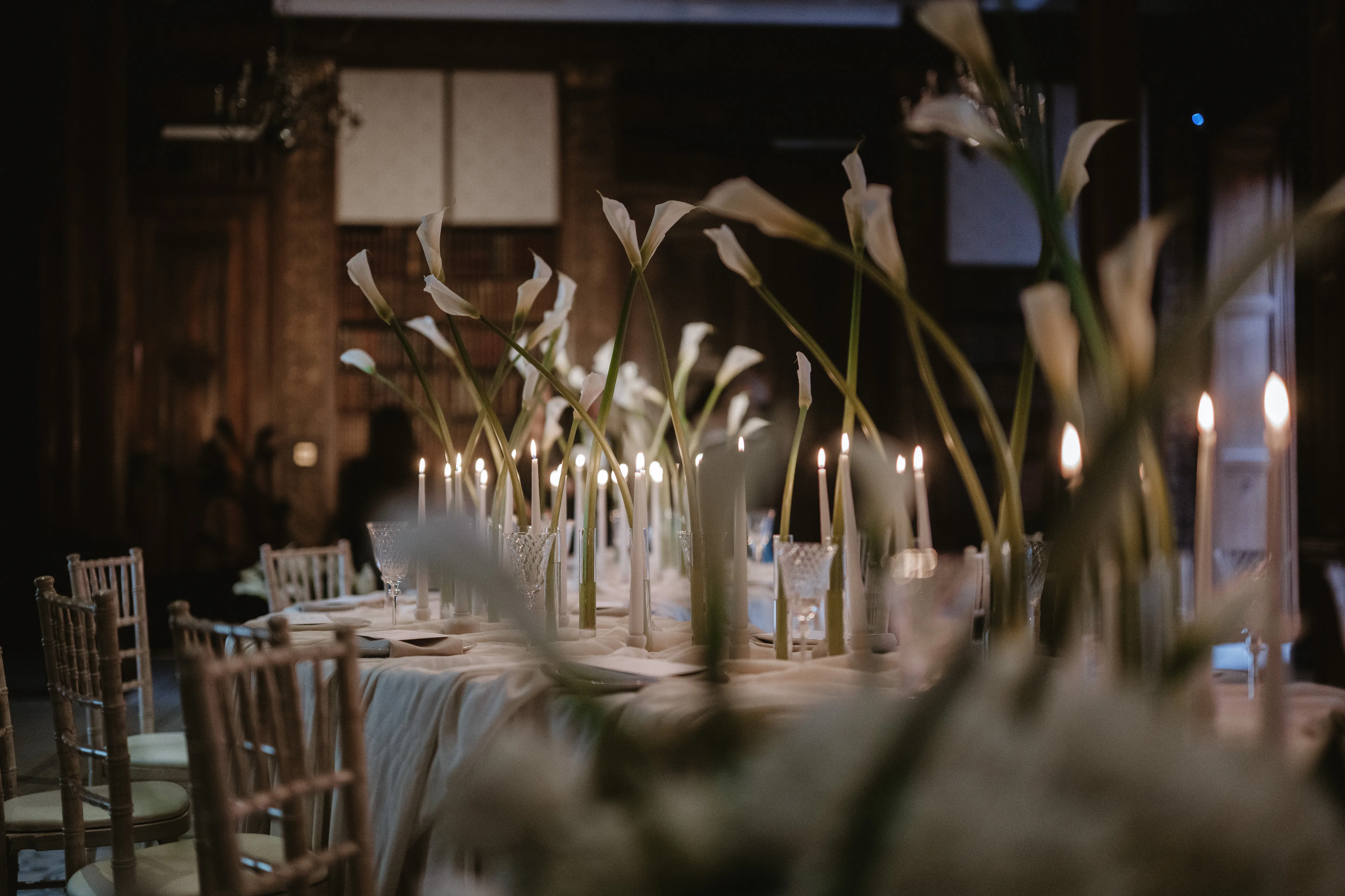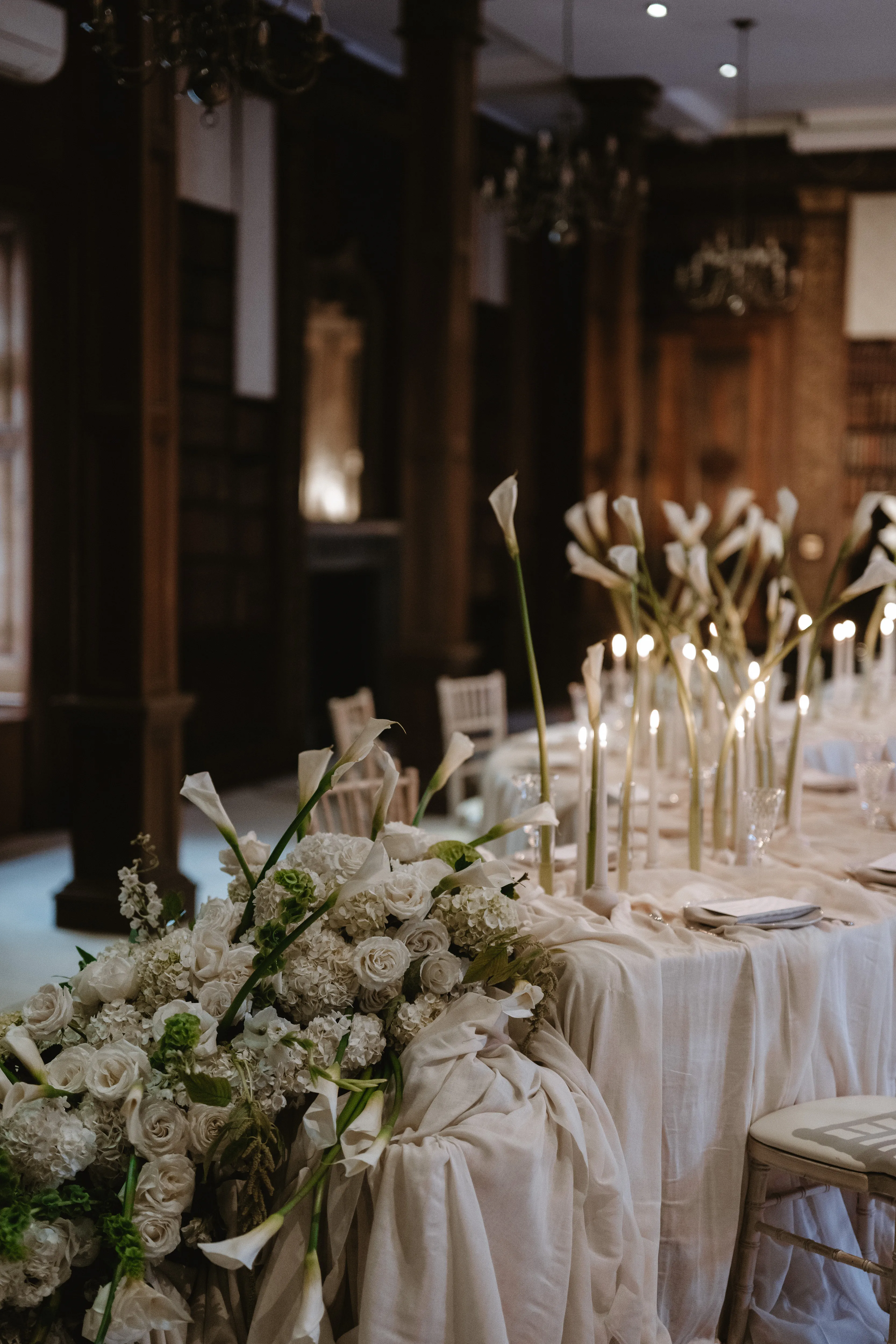 Floral centrepieces echoed the ceremony arrangements, while trailing foliage wrapped around the Library pillars, softening the structure of the room and tying everything together seamlessly.
