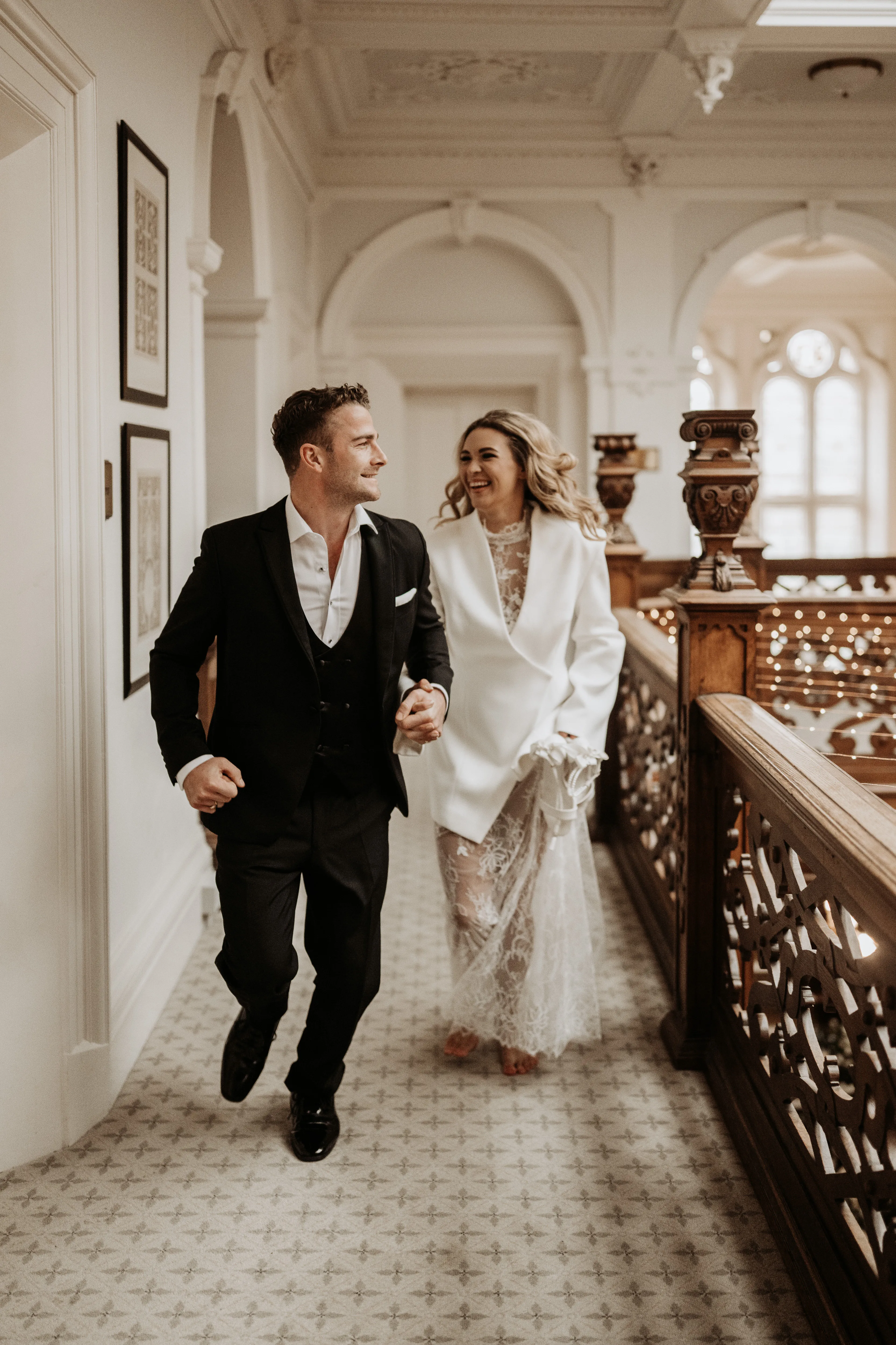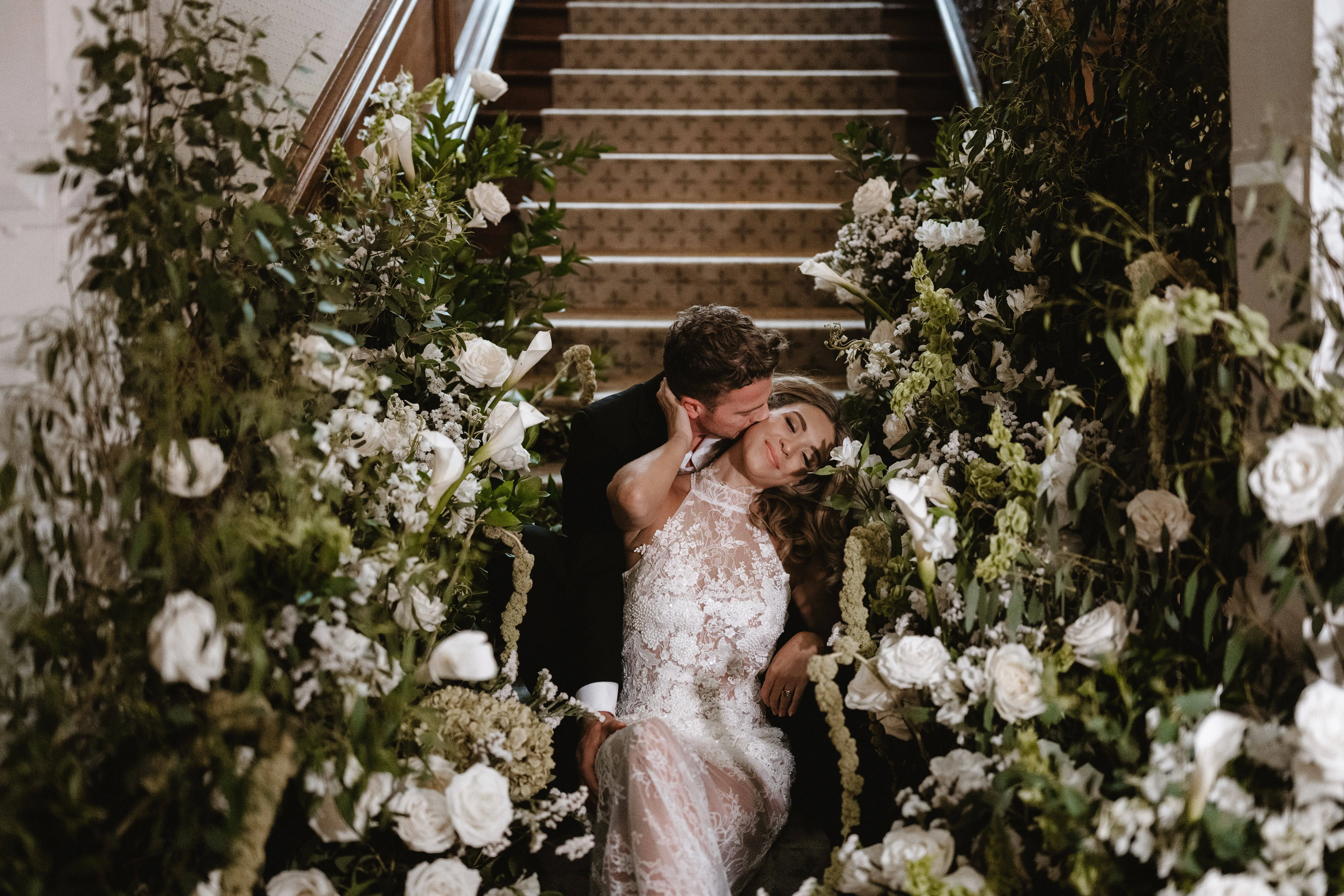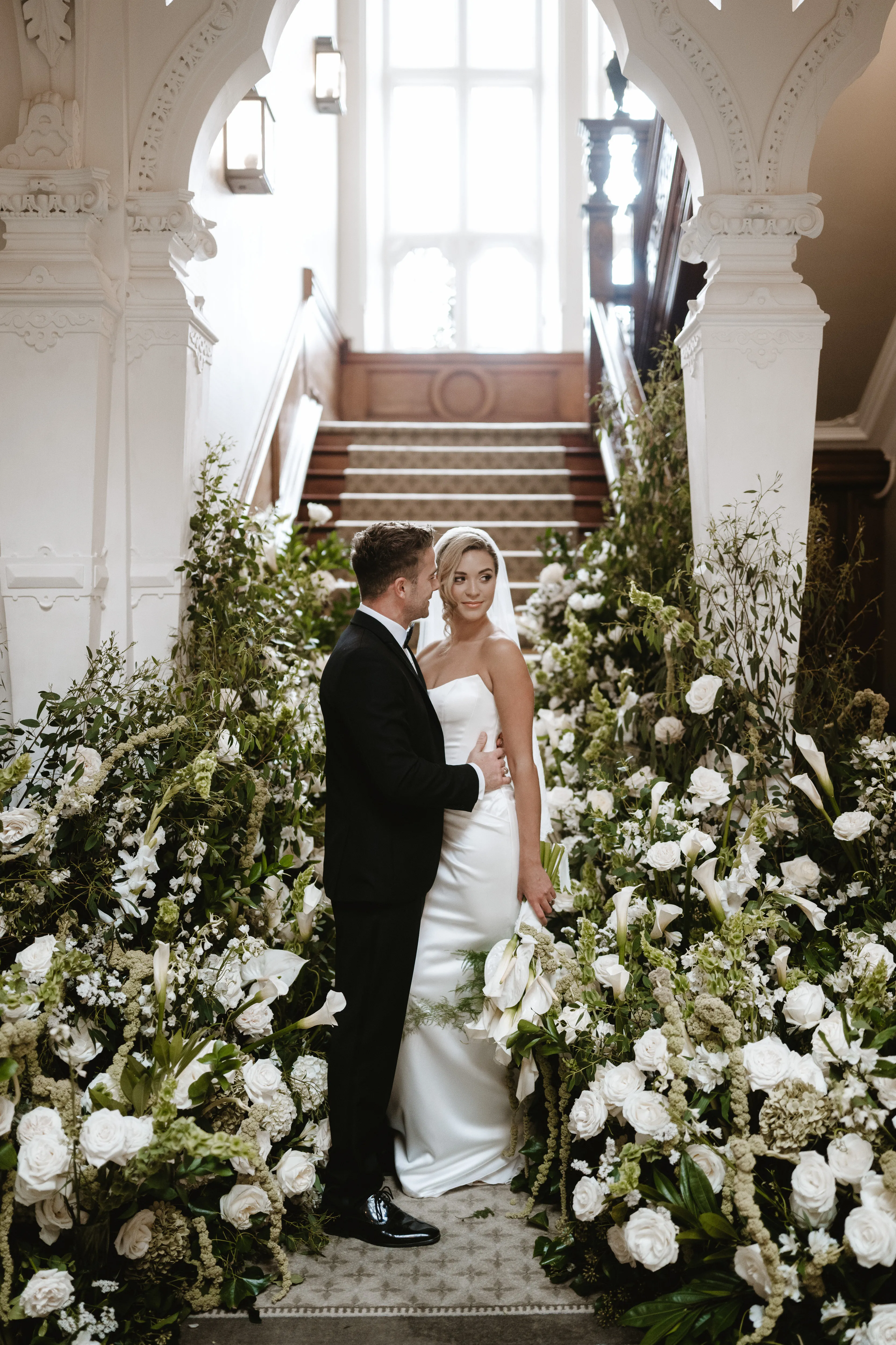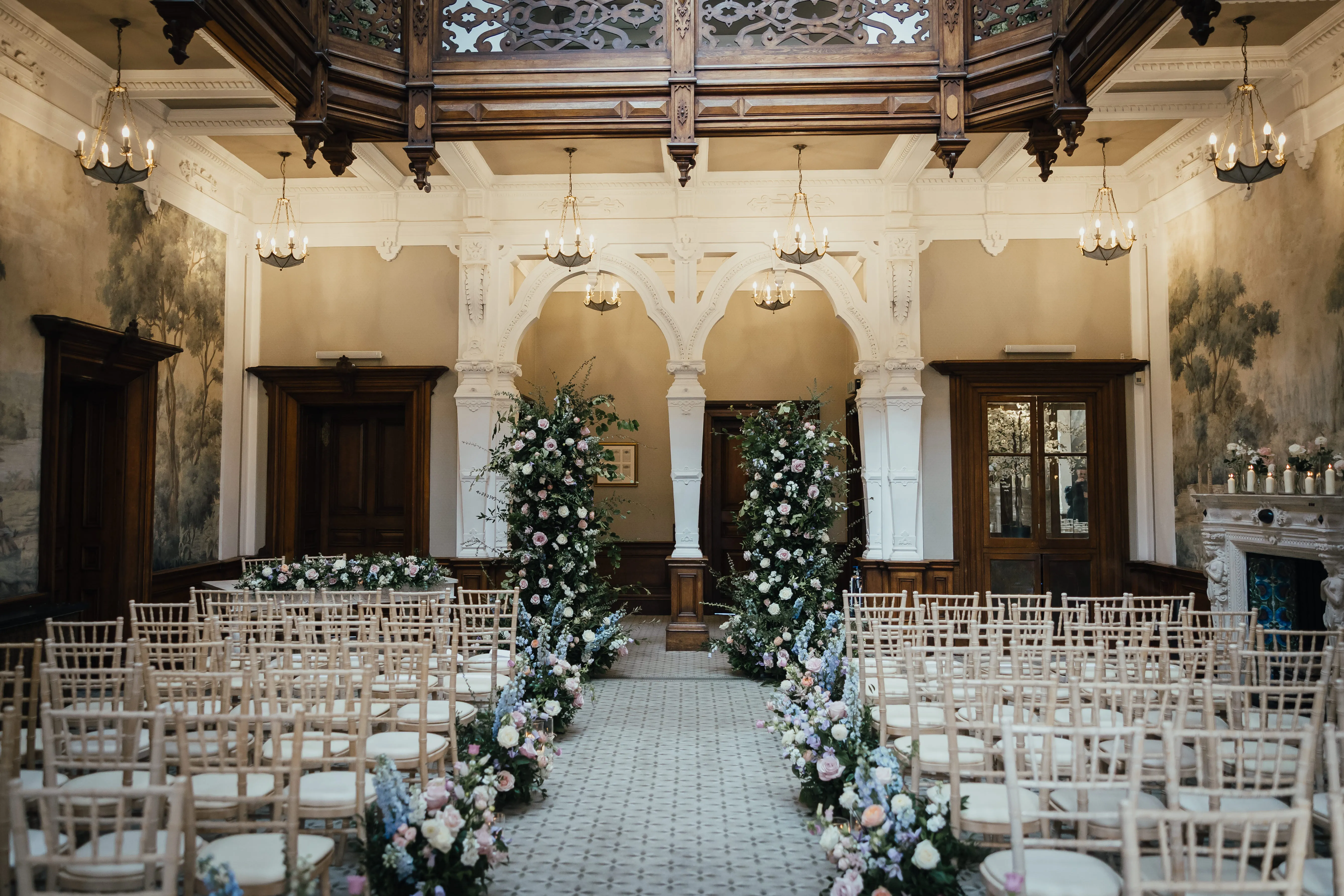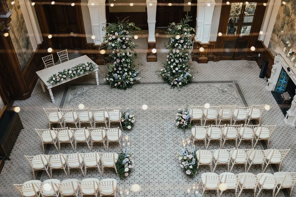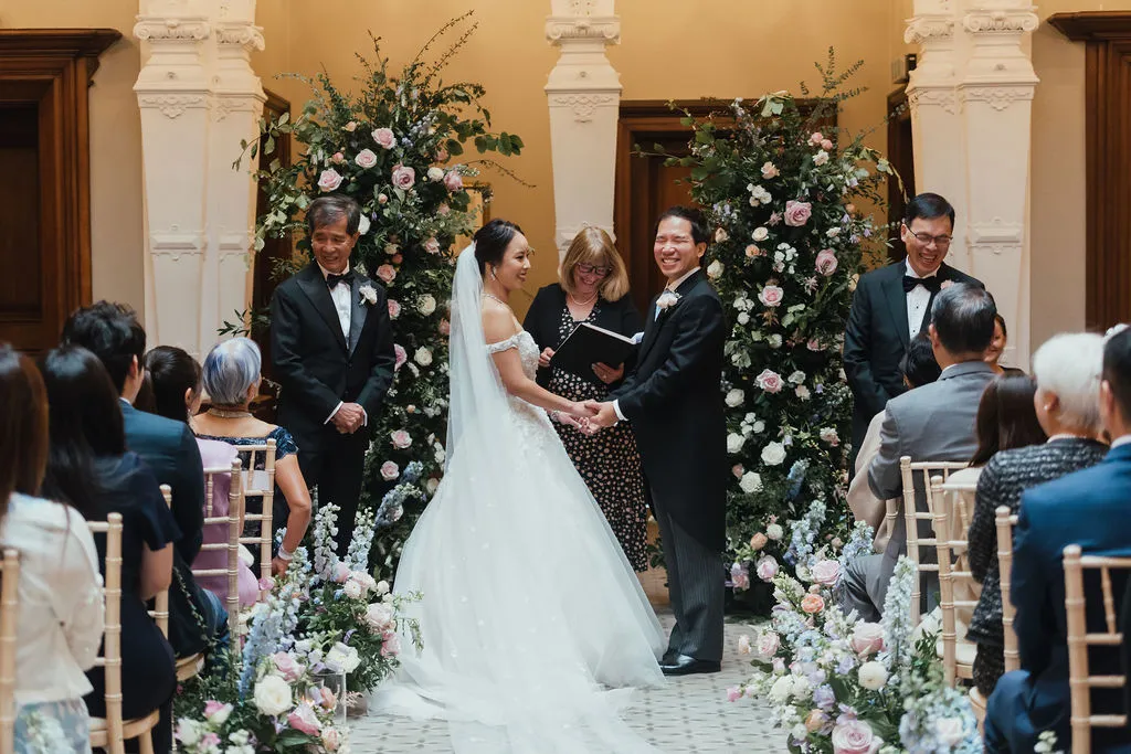 For the ceremony, a broken floral arch framed the space beautifully against the Hall’s historic architecture.