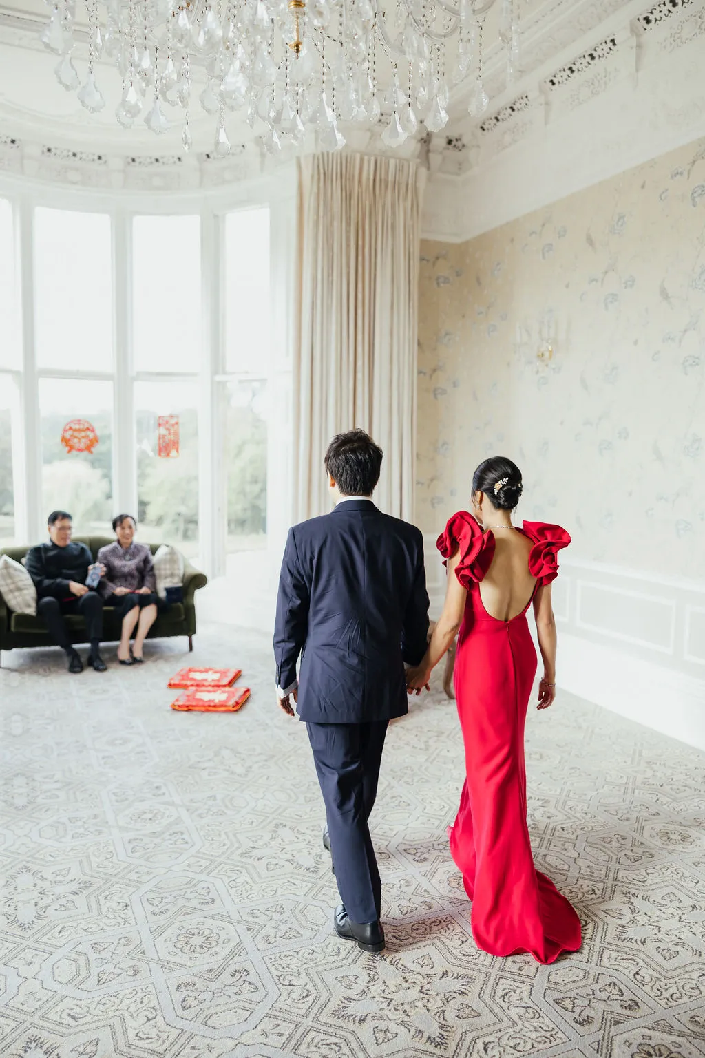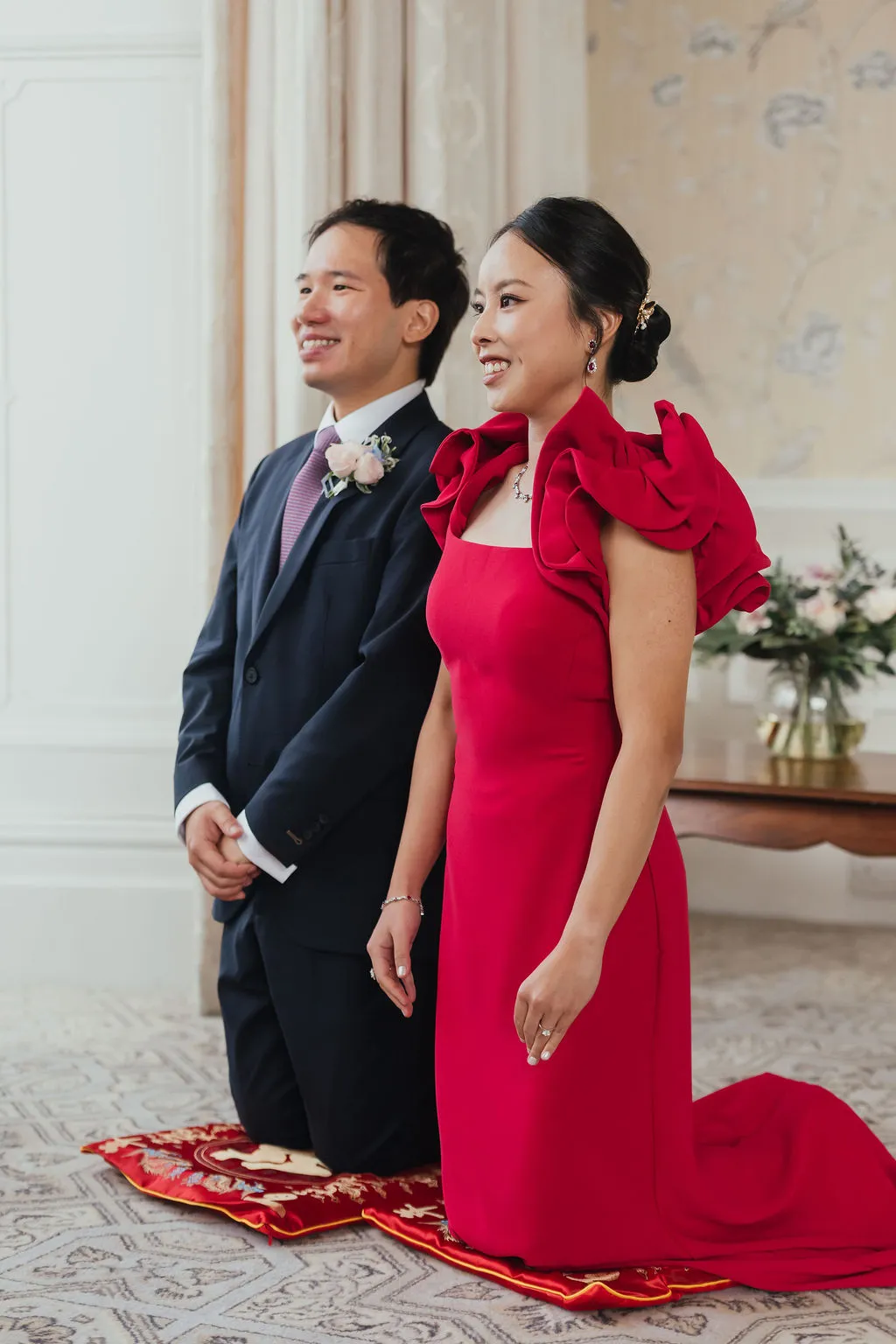 For the Chinese tea ceremony, red was central, symbolising luck, happiness, and prosperity in Chinese culture. We chose outfits that honoured tradition while still complementing the overall Western styling of the day.